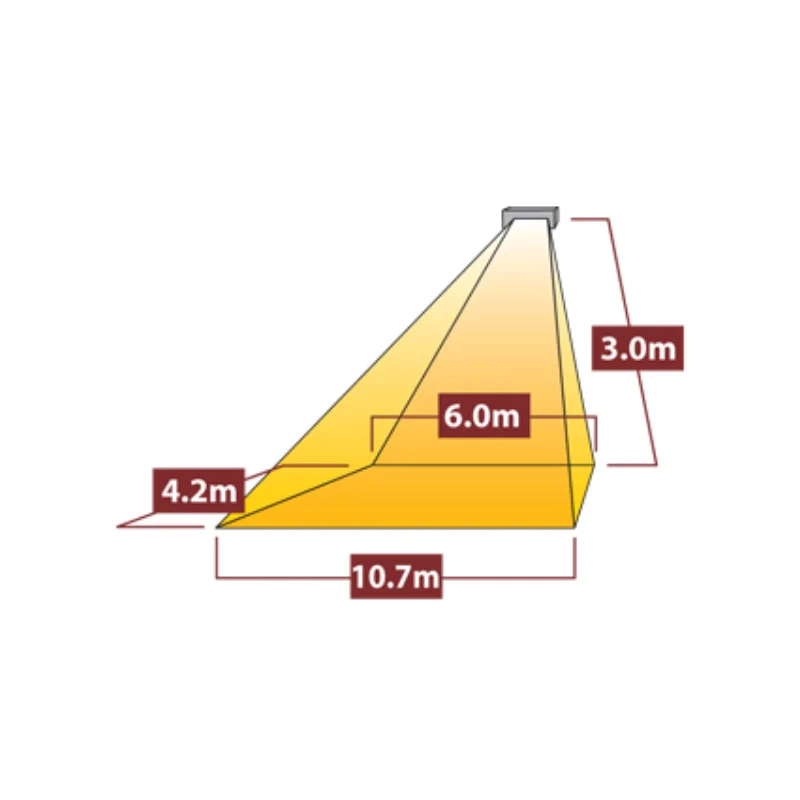 It covers around 14–18 m², depending on the mounting height and ambient temperature.